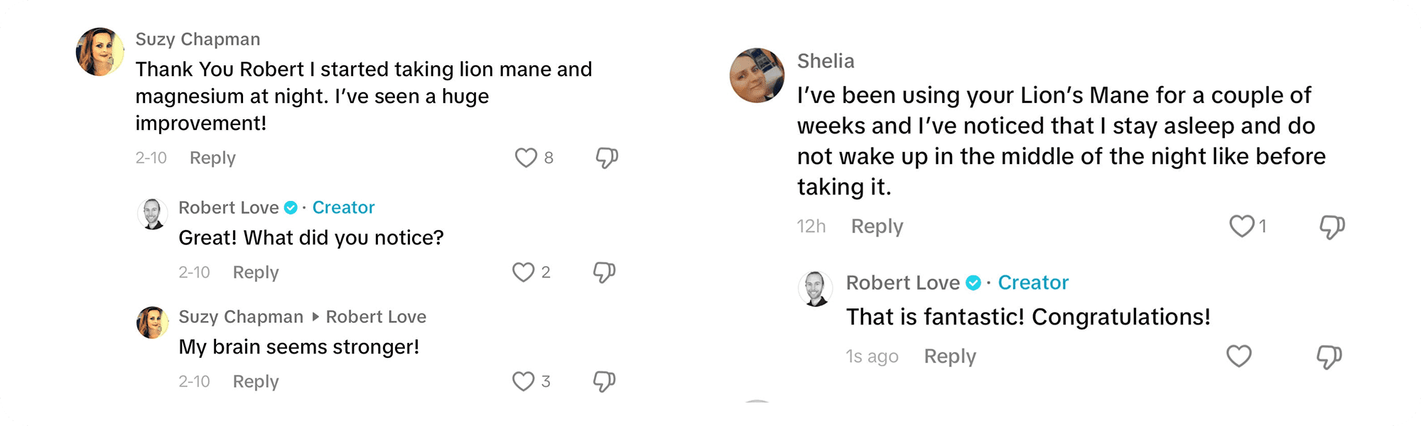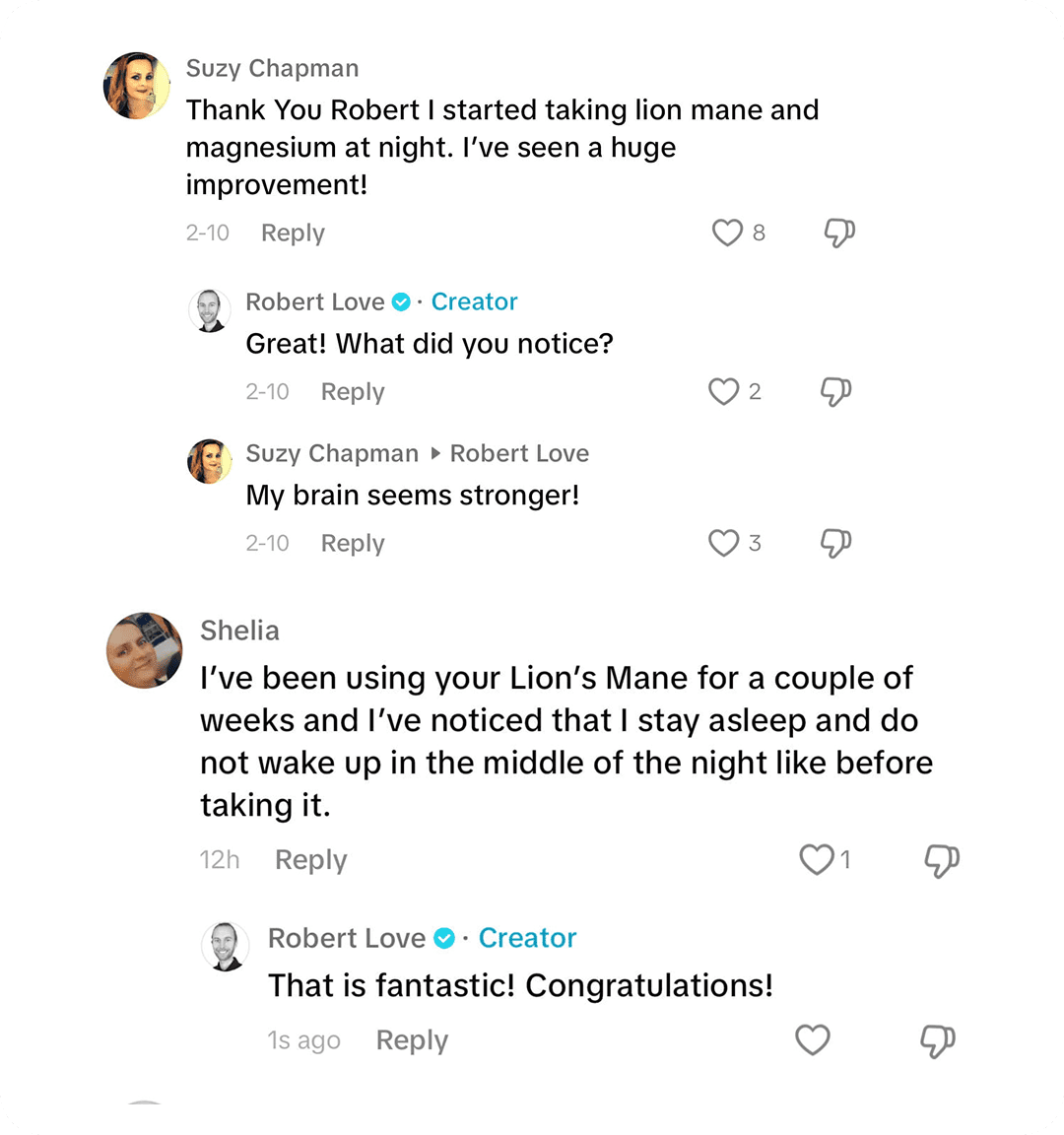 “Highly recommend Dr. Robert Love and his Zen Lion’s Mane. When I started taking it, I started feeling better the next day. I liked it so much that I bought several months’ worth for my family. This supplement works.”